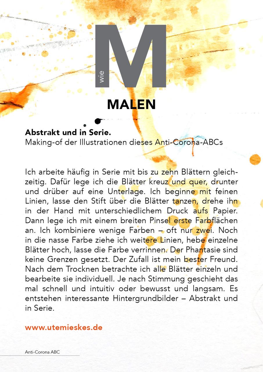Ute Mieskes lebt in Schweitenkirchen und sie hat sich extra für mein Anti-Corona-ABC in ihr Atelier begeben: Voilà, hier ist die Illustration für den Buchstaben M wie Malen. Wie sie vorgegangen ist, beschreibt Ute Mieskes in dem unten stehenden Text. Werfen Sie einen Blick hinter die Kulissen, genießen Sie das Making-of! Und wenn alles gut läuft und die Mal-Utensilien reichen, gibt es das Anti-Corona-ABC in ein paar Wochen dann als Booklet - eine Gemeinschaftsproduktion mit den Texten von mir und den Illustrationen von Ute Mieskes . Ich bin jetzt schon ganz aufgeregt...