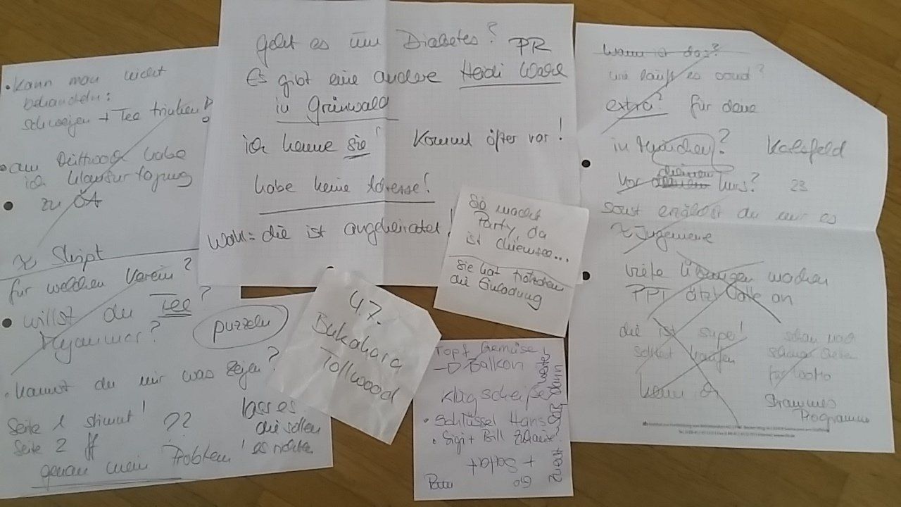 mit Zettelchen und per Handzeichen. Wenn wir Leute beim Spaziergehen getroffen